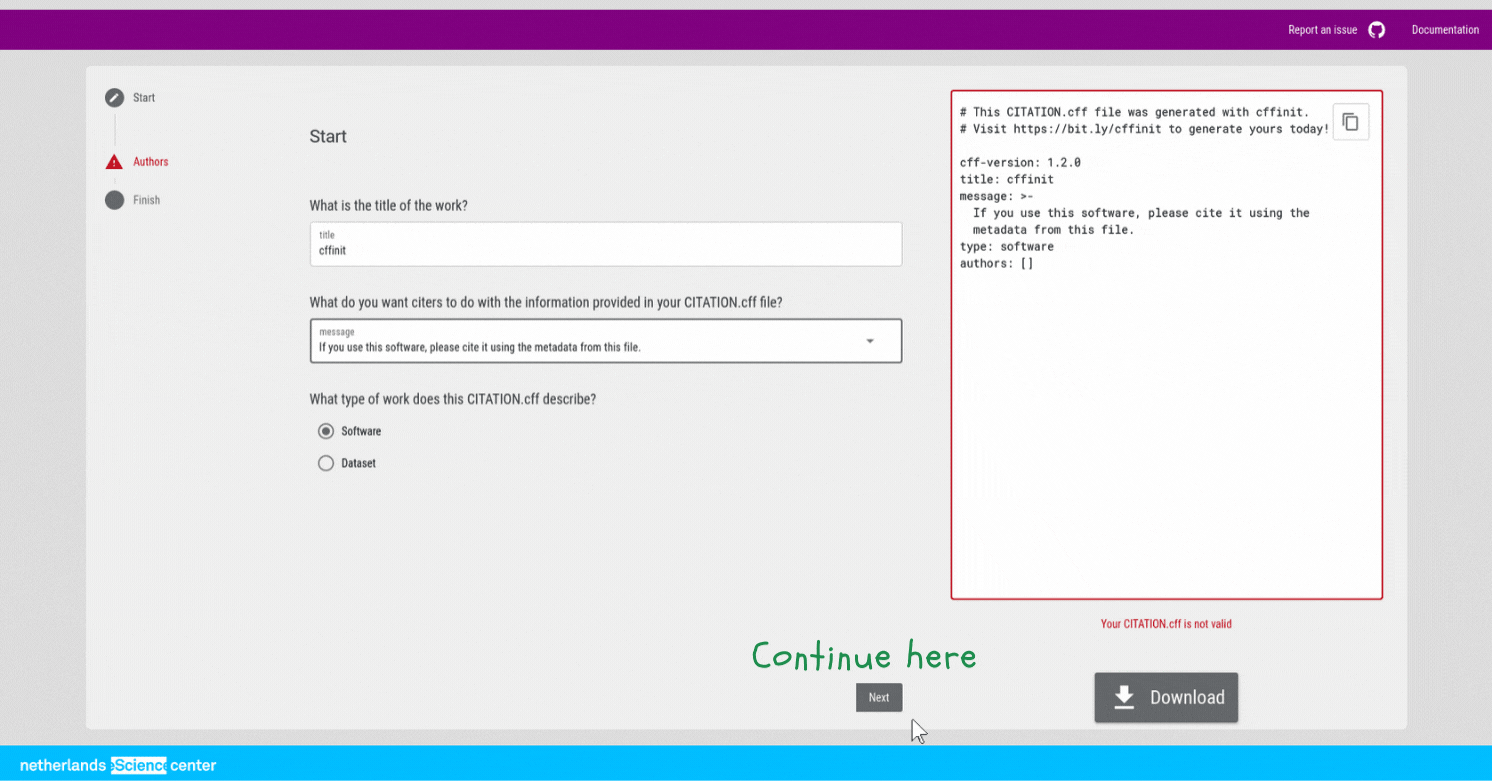 On the first page of the application, enter the title of your work, write a message to indicate how you want your software to be mentioned, and select whether you are creating a CITATION.cff file for software or a dataset.