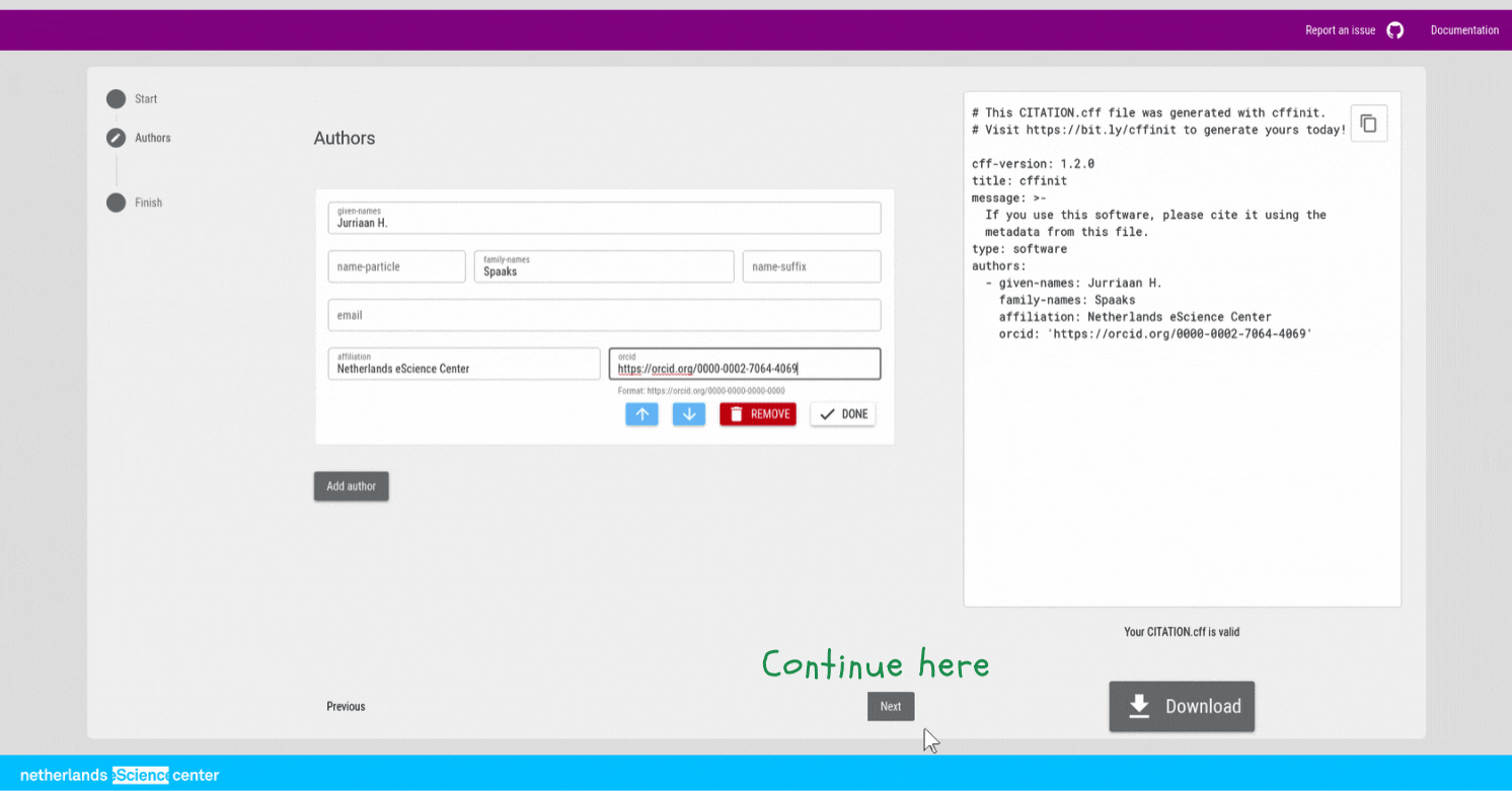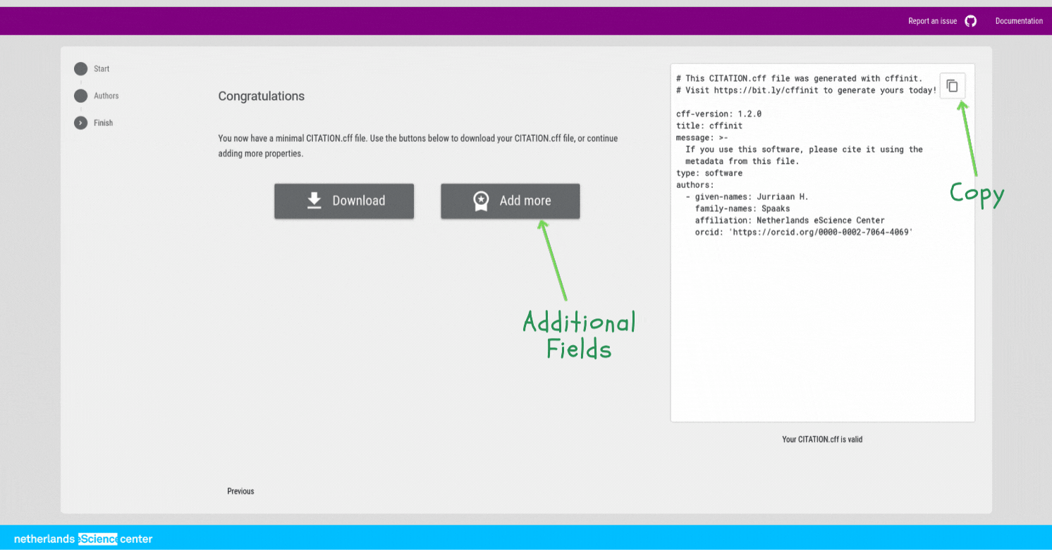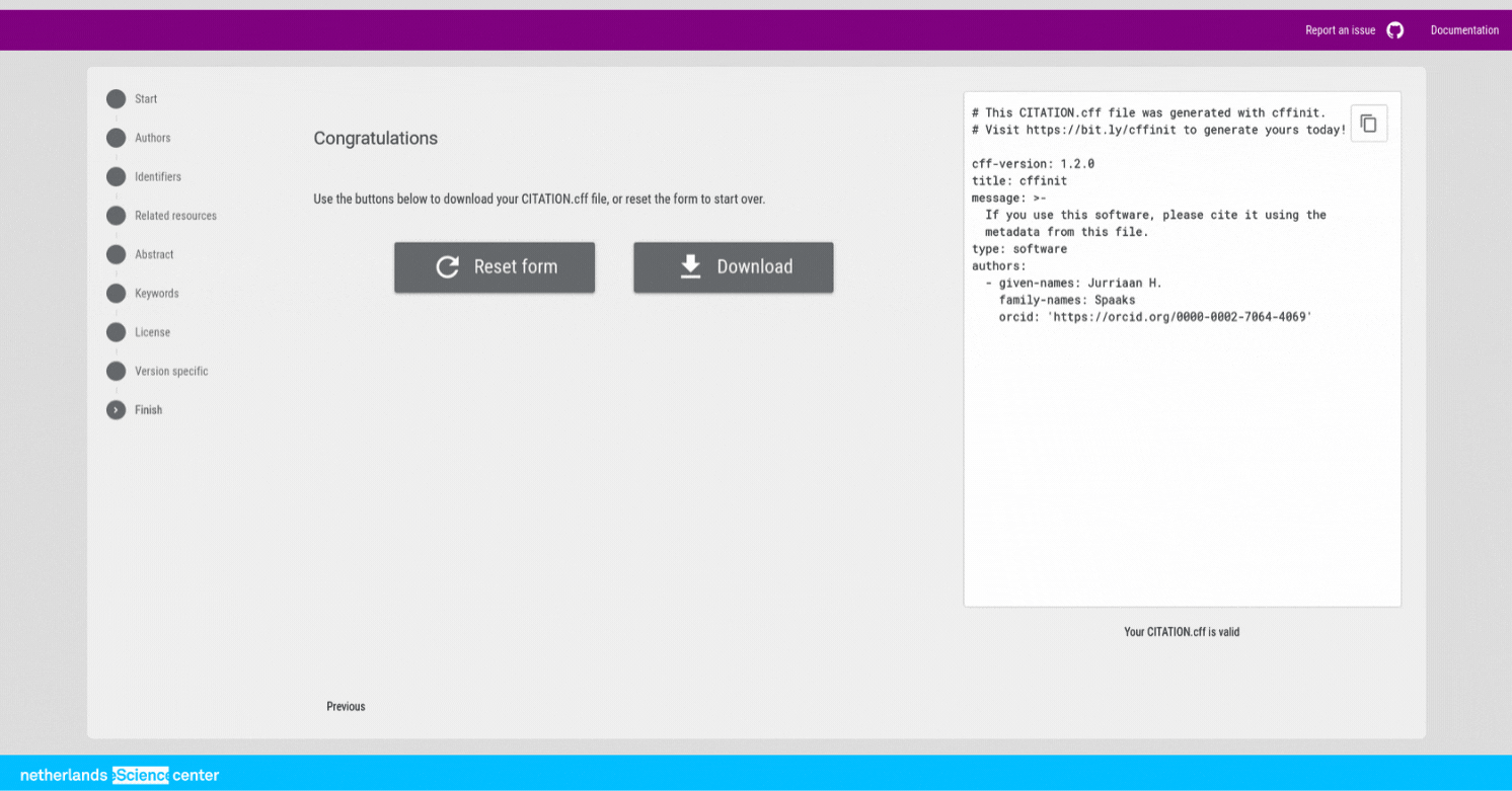 After adding all the relevant information, you will have a validated CITATION.cff file.
