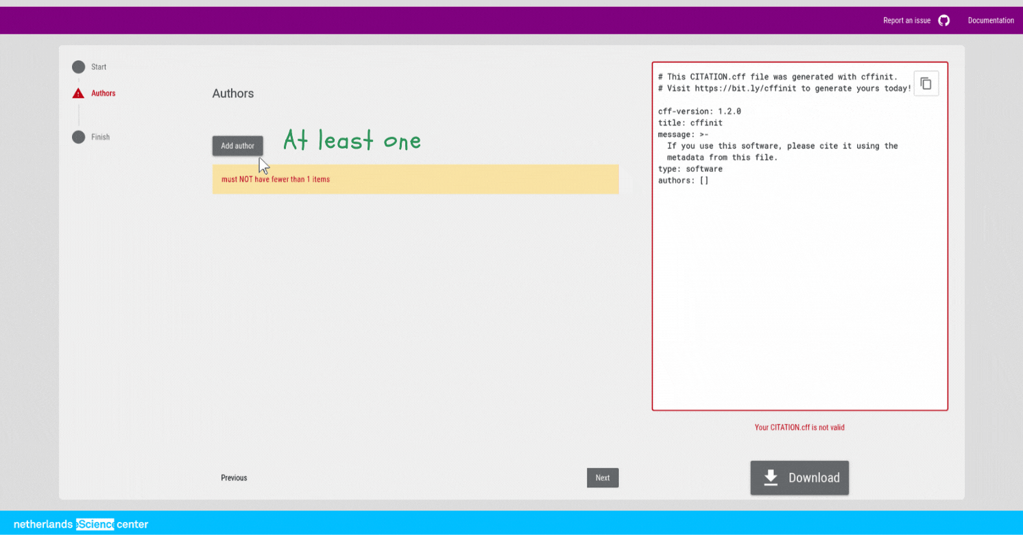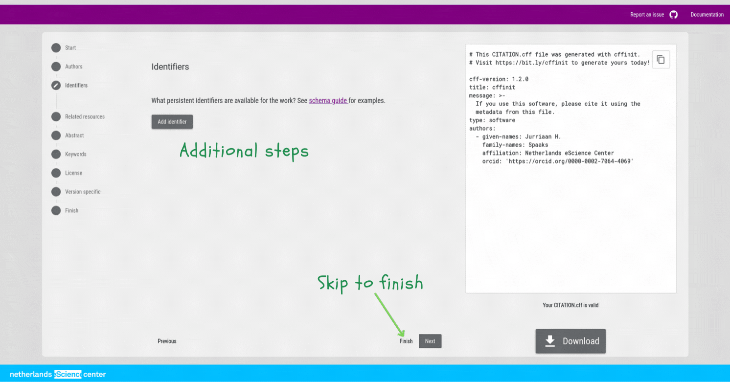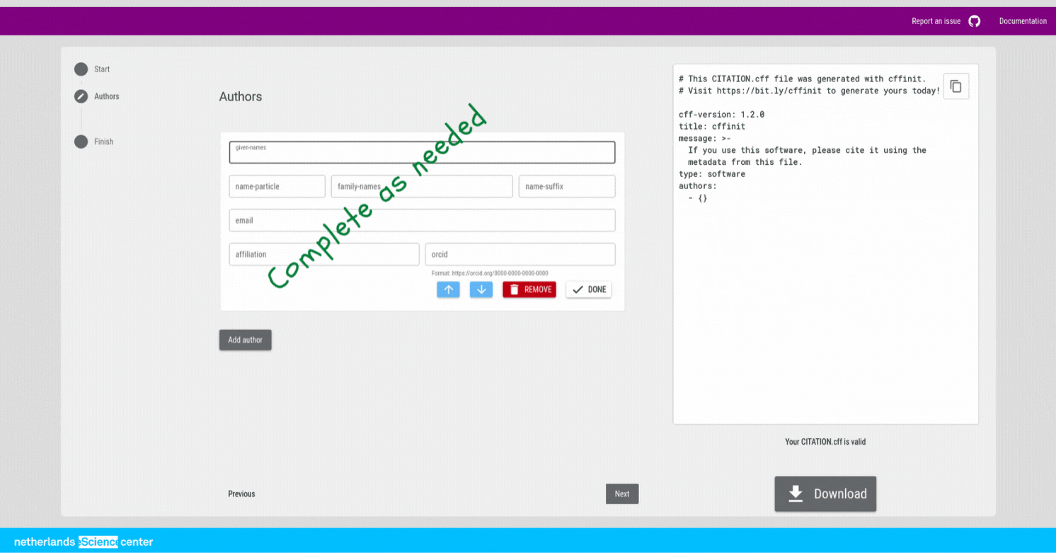After adding all the relevant information, you will have a validated CITATION.cff file.
