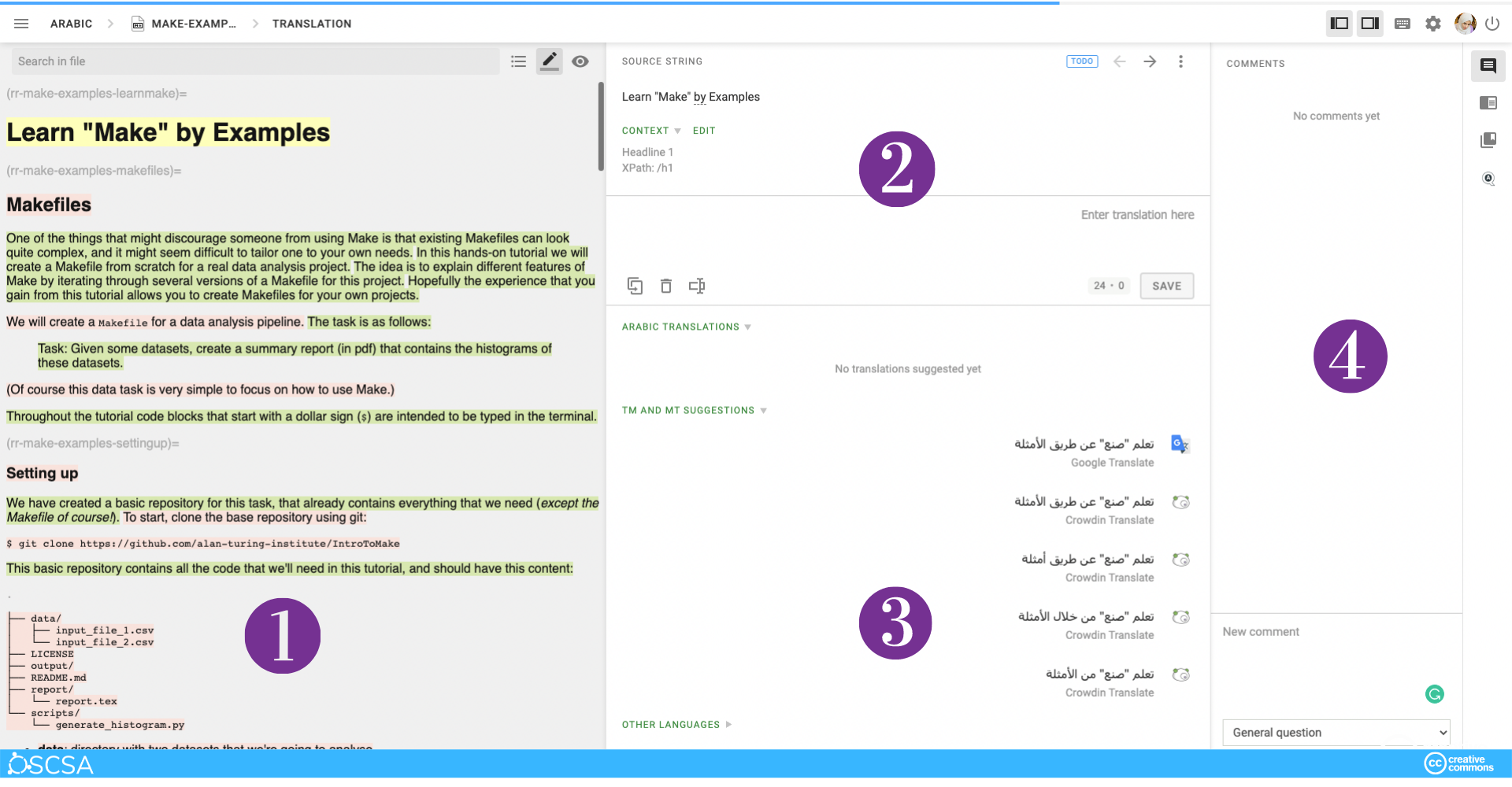 Crowdin editor won’t only show you suggestions of a translation made by the translation engine but also suggestions from translation in different projects that shared their Translation Memory (TM) with The Turing Way and will be detected if the string is has a similarity above 70%. This avoids duplication of effort. If you would like to re-use our Translation Memory (TM) in your own open-source projects, feel free to contact our Translation and Localisation leads.